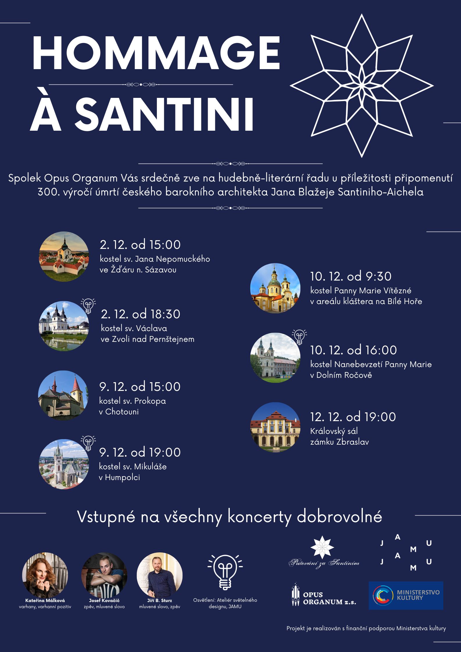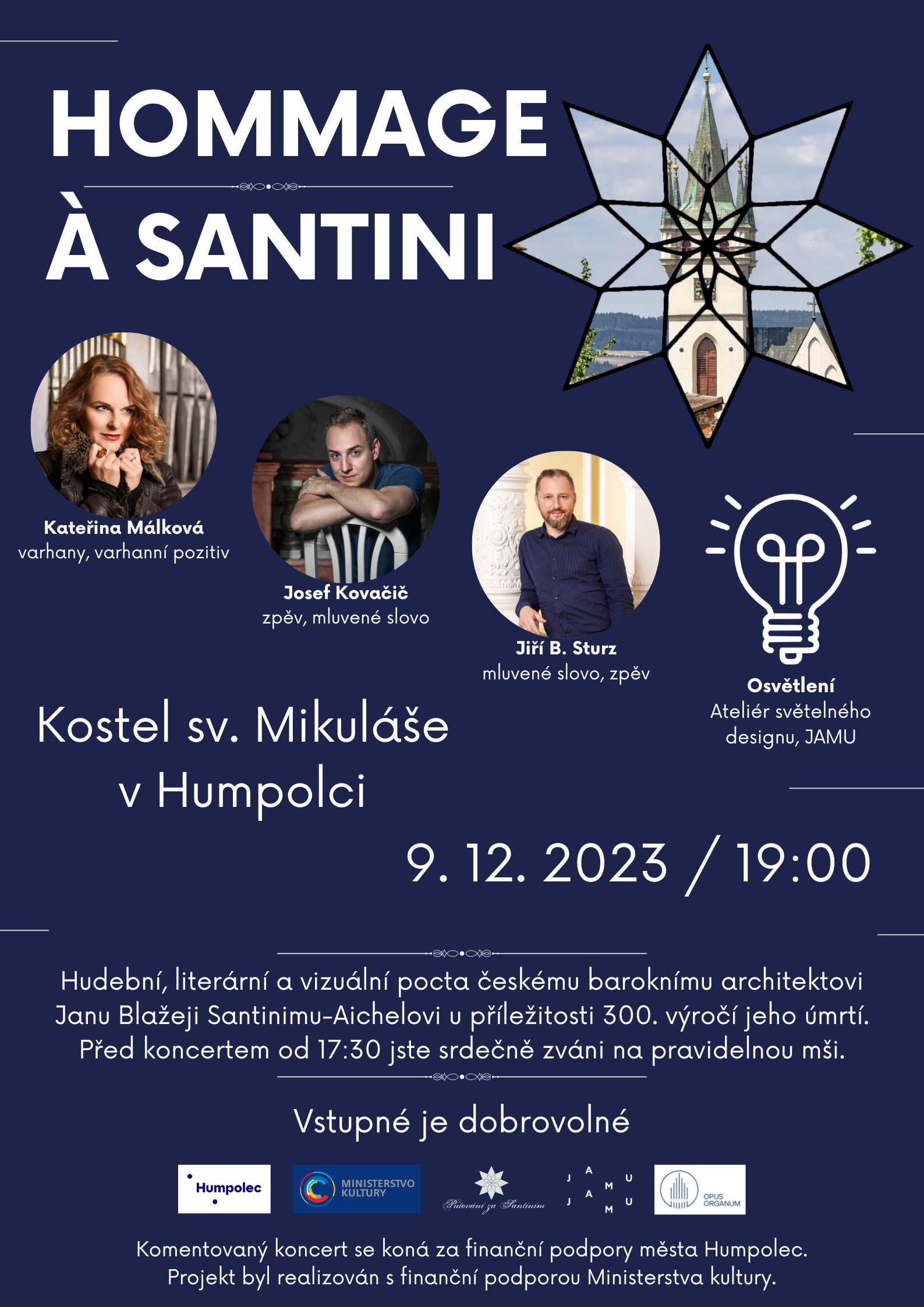 | Text důvodové zprávy: | Jiří Bartoloměj Sturz ze spolku Opus organum, z.s. nás požádal o poskytnutí finanční podpory od města Humpolce ve výší 7 - 15 tisíc Kč. na podporu koncertu Hommage á Santini, který se uskuteční dne 9.12.2023 v kostele sv. Mikuláše v Humpolci. Z iniciativy společnosti Opus organum a za grantové podpory Ministerstva kultury proběhne v prosinci na celkem sedmi místech (pouze sedmi - je to záměrně "santiniovské číslo") cyklus komentovaných koncertů věnovaných 300. výročí úmrtí architekta Jana Blažeje Santiniho-Aichela. Připraven je zhruba hodinový program varhanní a vokální hudby českého baroka v podání umělců Kateřiny Málkové (varhany) a Josefa Kovačiče (zpěv), dále slovem, a na historický hudební nástroj "Tromba marina" bude provázet historik, zpěvák a publicista Jiří B. Sturz, který diváky obeznámí s podivuhodným životem Santiniho a poodhalí unikátnosti jeho realizací. Součástí koncertu bude také světelný design, který předvede památku "v novém světle" a upozorní na specifika Santiniho realizace. Koncert (humpolecká sedmina projektu) proběhne v sobotu 9. 12. 2023 od 19 hodin v kostele sv. Mikuláše. Vstupné koncertu je dobrovolné. Nutno podotknout, že je mezi historiky diskutabilní vliv stavitele Santiniho na přestavbu kostela v Humpolci, na což jsme zástupce spolku upozornili. Každopádně se bude jednat o jeden ze 7 výjimečných koncertů, který chceme ve městě podpořit. Necháme na Radě města Humpolec ke zvážení, v jaké výši.